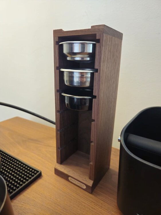Suporte de madeira nobre para cestos de café 58mm, ideal para manter a estação de preparo organizada e prática. Design elegante e funcional, acomoda diversos baskets de forma segura e acessível. Produto de alta qualidade, combina durabilidade com estética sofisticada, perfeito para baristas e entusiastas que valorizam organização e estilo no preparo do espresso. (NÃO ACOMPANHA OS CESTOS) OLX: https://sp.olx.com.br/sao-paulo-e-regiao/para-a-sua-casa/utensilios-para-cozinha/suporte-de-madeira-para-cestos-de-cafe-espresso-58mm-1454445273 Mercado Livre: https://www.mercadolivre.com.br/suporte-de-madeira-para-cestos-de-cafe-espresso-58mm/up/MLBU3572228836?pdp_filters=item_id:MLB4311576363 c-2.webp c-1.webp