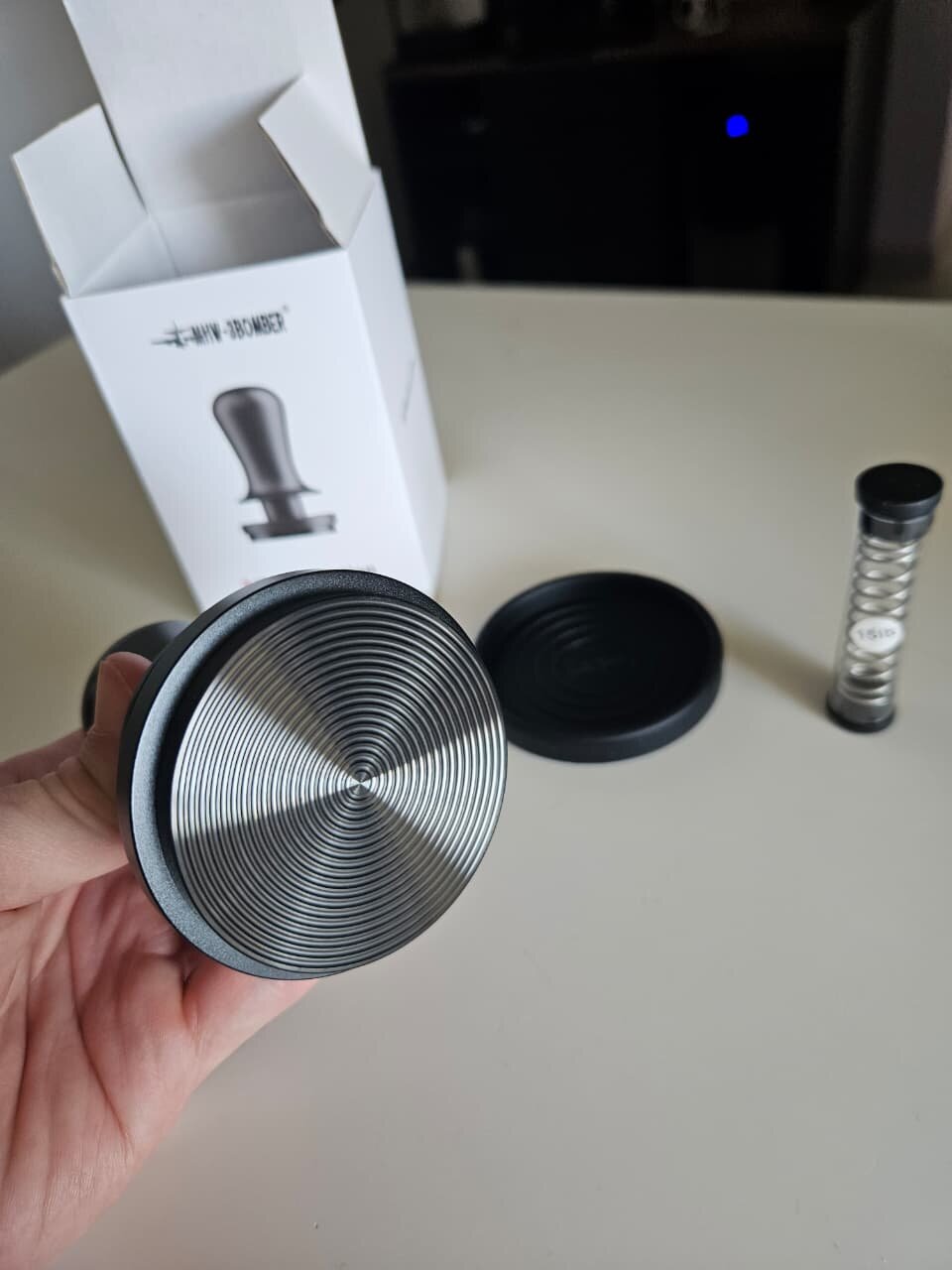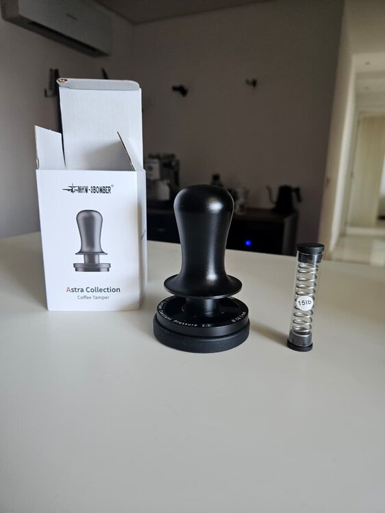 Spring Tamper MHW-3Bomber 58.5MM Astra Collection, modelo profissional com base Rippled que garante nivelamento uniforme e extração consistente do café. Nunca foi utilizado, acompanha caixa original, mola de 30lb instalada, mola reserva de 15lb e mat para apoiar o tamper. Produto de alta precisão, ideal para quem busca melhorar a performance no espresso e ter resultados consistentes em cada extração. OLX: https://sp.olx.com.br/sao-paulo-e-regiao/para-a-sua-casa/utensilios-para-cozinha/tamper-de-precisao-mhw-3bomber-58-5mm-astra-collection-novo-na-caixa-1440494178 Mercado Livre: https://produto.mercadolivre.com.br/MLB-5746790210-tamper-de-preciso-mhw-3bomber-585mm-astra-collection-_JM