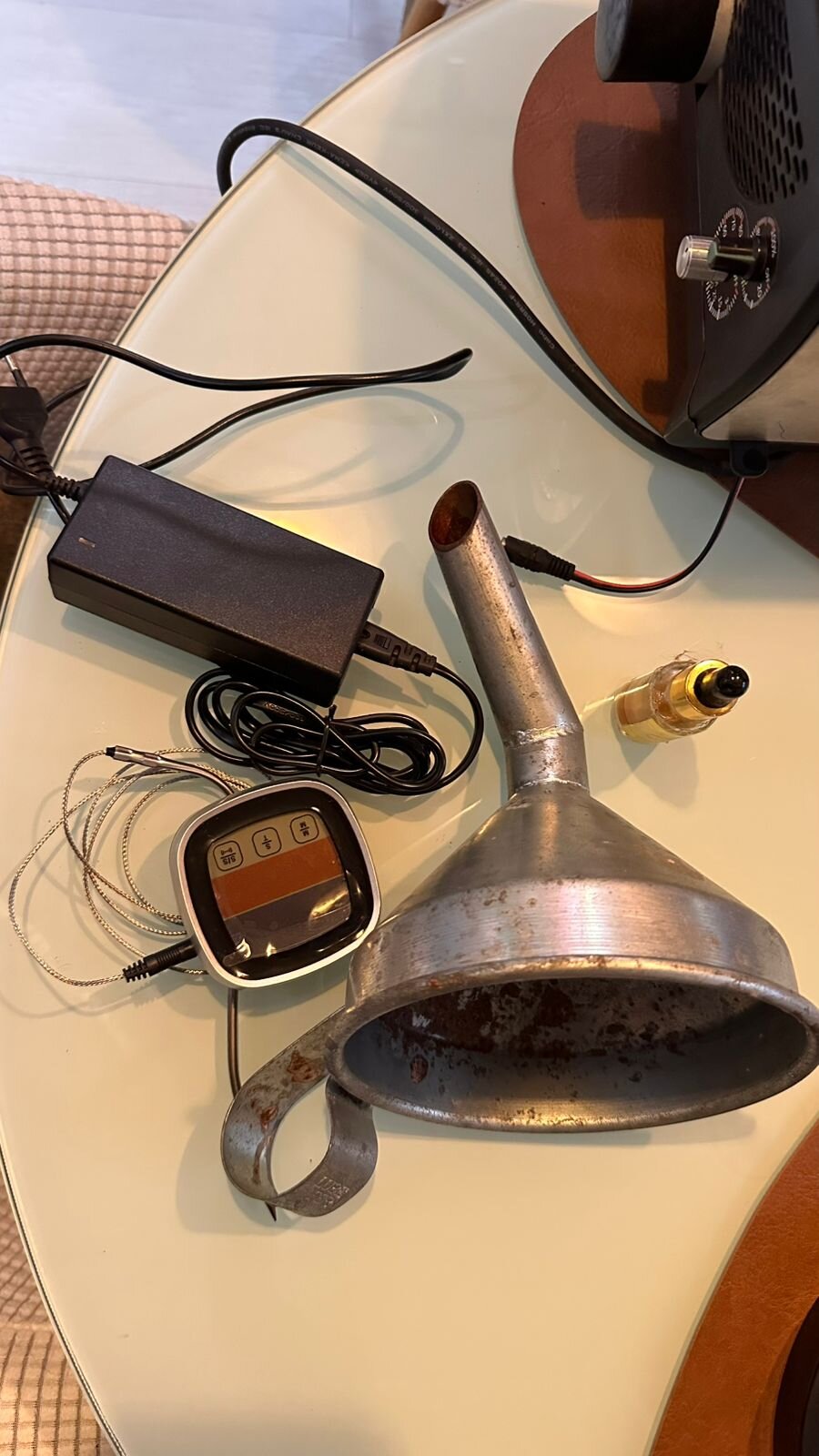 Acompanha funil para colocar os grãos no forno, óleo para lubrificar o eixo, colher para verificar o processo de torra, termômetro digital para acompanhar a temperatura interna, fonte de alimentação do motor e cooler.