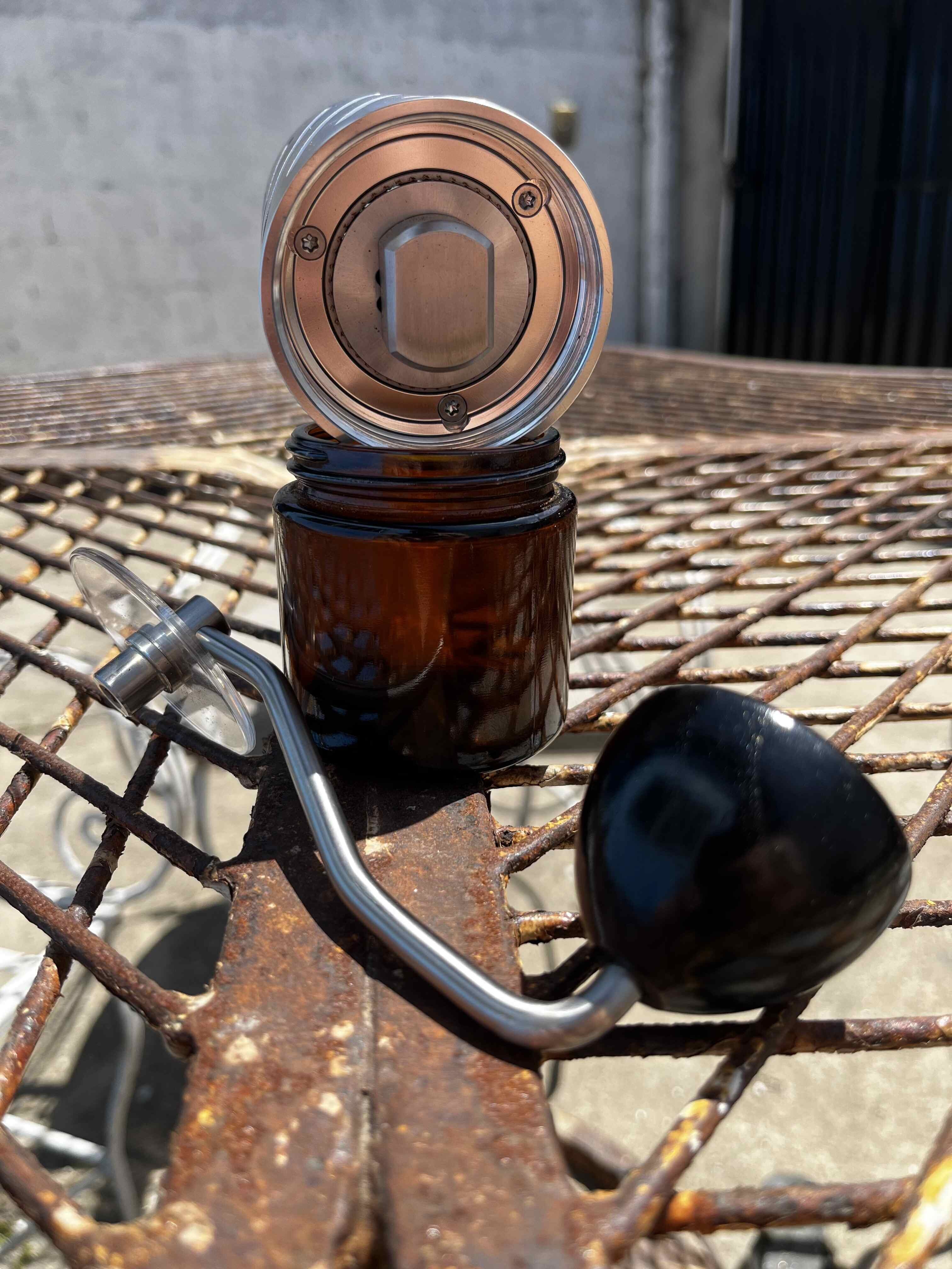 O corpo é feito em alumínio, por conta disso o peso é cerca de 290g mais leve que o Comandante. Todo o sistema de mós e o que segura ela no corpo é em aço. O copo coletor também é de alumínio. Cabe cerca de 45-50g de café dentro. É compatível com os copos do Comandante/Mischief.